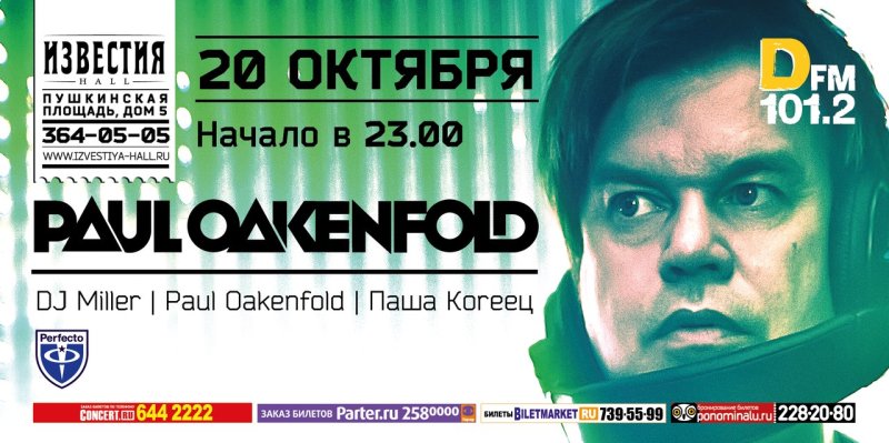 Концерт Paul Oakenfold состоится 20 Октября 2012 на сцене Известия Hall. На MusicAfisha.ru вы можете узнать подробности события, посмотреть вероятный треклист и купить билеты на концерт Paul Oakenfold без наценки и комиссии. Также у нас можно найти компанию для его посещения и заказать альбомы Paul Oakenfold на CD. Кроме того, ниже вы можете посмотреть видео с недавних выступлений Paul Oakenfold.