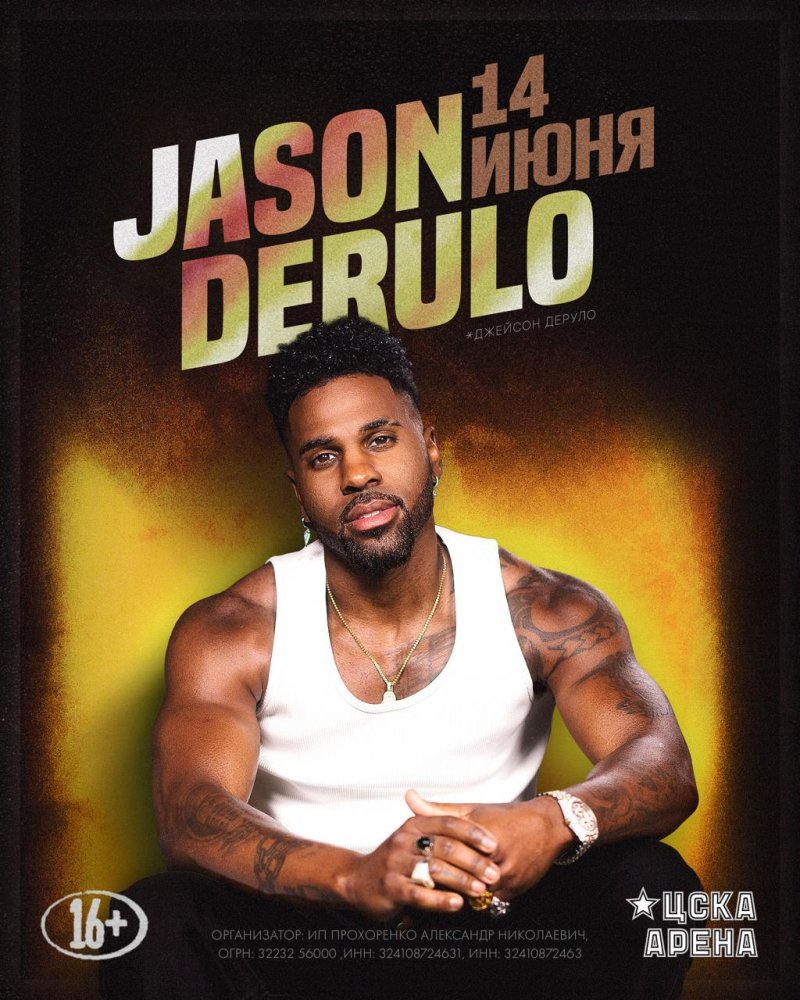 Концерт Jason Derulo состоится 14 Июня 2026 на сцене ЦСКА Арена. На MusicAfisha.ru вы можете узнать подробности события, посмотреть вероятный треклист и купить билеты на концерт Jason Derulo без наценки и комиссии. Также у нас можно найти компанию для его посещения и заказать альбомы Jason Derulo на CD. Кроме того, ниже вы можете посмотреть видео с недавних выступлений Jason Derulo.