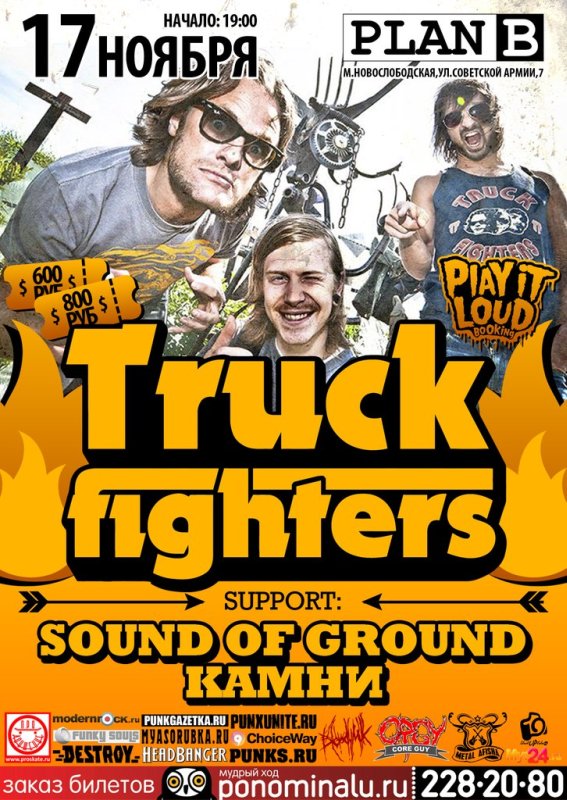 Концерт Truckfighters состоится 17 Ноября 2013 на сцене Plan B. На MusicAfisha.ru вы можете узнать подробности события, посмотреть вероятный треклист и купить билеты на концерт Truckfighters без наценки и комиссии. Также у нас можно найти компанию для его посещения и заказать альбомы Truckfighters на CD. Кроме того, ниже вы можете посмотреть видео с недавних выступлений Truckfighters.