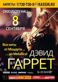 8 сентября на сцене "Крокус Сити Холла" впервые с программой "кроссовер" - "От Моцарта до Металлики" выступит Дэвид Гаррет (David Garrett). Кроме того, Дэвид исполнит хиты всемирно известных рок и поп исполнителей, музыку из известных кинофильмов, а также классические произведения.