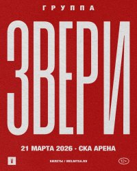 Концерт Звери состоится 21 Марта 2026 на сцене СКА Арена. На MusicAfisha.ru вы можете узнать подробности события, посмотреть вероятный треклист и купить билеты на концерт Звери без наценки и комиссии. Также у нас можно найти компанию для его посещения и заказать альбомы Звери на CD. Кроме того, ниже вы можете посмотреть видео с недавних выступлений Звери.